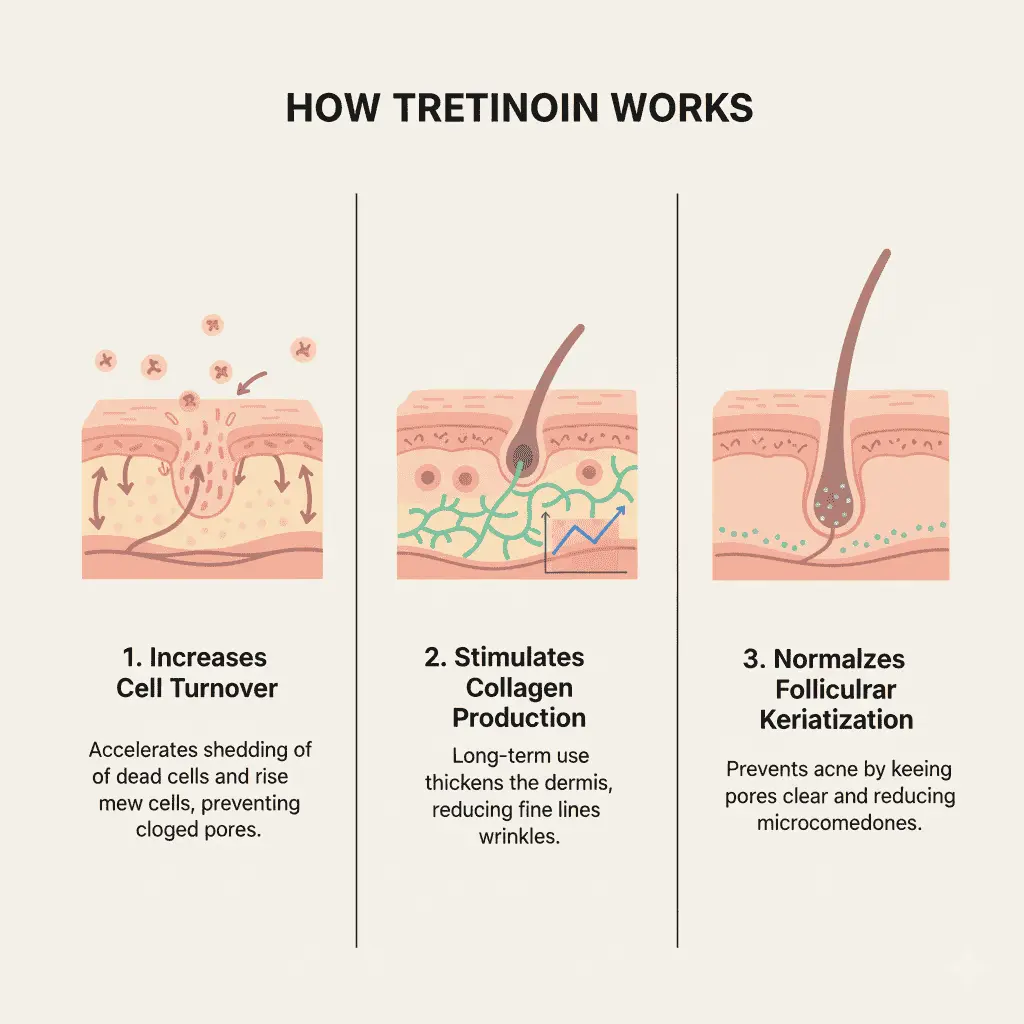 This triple action explains why tretinoin treats both acne and ageing simultaneously, something very few skincare ingredients can do.